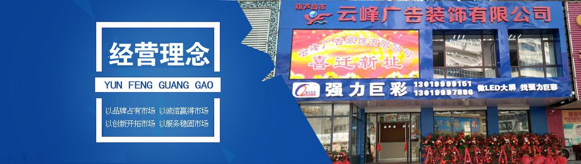 葫蘆島市云峰廣告裝飾有限公司自創(chuàng)立以來,一直致力于廣告牌的設(shè)計,噴繪,制作,安裝、LED工程、亮化工程、數(shù)碼圖文、圍擋制作安裝、三面翻廣告、大型擎天柱廣告、草坪牌、指示牌、雕刻背景墻、燈箱設(shè)計、標識標牌、金屬制品、亞克力字、展臺展柜、取款機隔斷、取款機隔斷等一體化服務(wù),是葫蘆島市噴繪行業(yè)大規(guī)模實業(yè)公司。